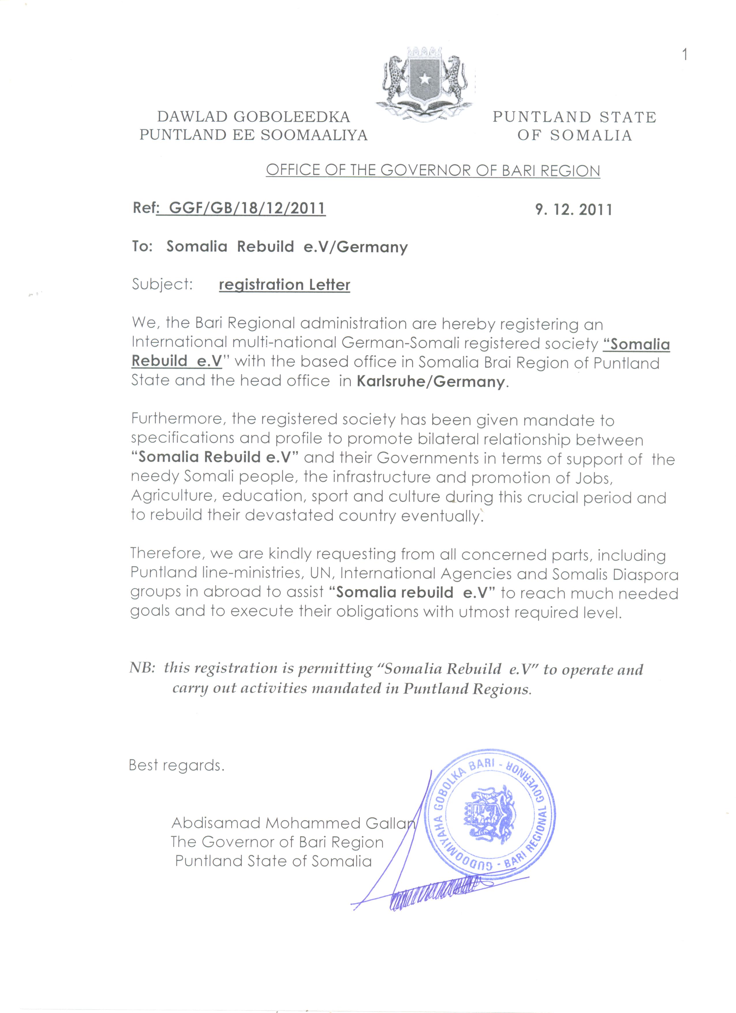 PS.: Diese Registration erlaubt Somalia Rebuild e.V. völkerrechtlich in Puntland Regionen